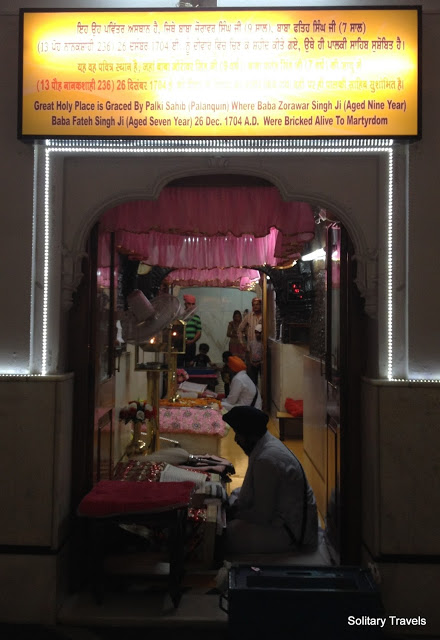 The grand Gurudwara Fatehgarh Sahib holds in its bosom the holy room were the young saahibzadas were bricked alive. The exact place were the martyrs were bricked is marked by an intricately carved palanquin. Besides this holy room, there is enough space all around the basement for devotees to sit and and read from the religious scriptures.